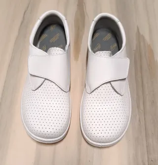 Vendo un par de zapatos de seguridad para enfermería. Son de color blanco y tienen un diseño limpio y sencillo. - Perfectos para uso diario. - Cómodos y resistentes. - Material: Piel sintética.