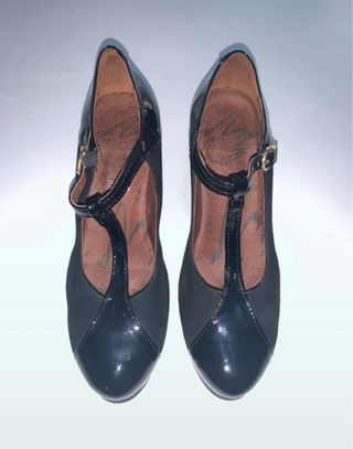 zapato/tacones negros de salon de la firma PATRICIA MILLER (hechos en España). son IDEALES para mantilla, es un zapato muy elegante, se sujeta perfectamente al pie y son COMODISIMOS. Me he pensado mucho venderlos pero me regalaron unos muy parecidos porque son comodidimos e ideales. Solo me los he puesto una vez para salir de mantilla (se puede ver en la suela). El tacon tiene 9 cm lo que hace que estilice muchisimo la pierna y tiene una pequeña plataforma de 4 cm lo que hace que el zapato sea muy comodo. La suela es antideslizante, se coge con hebilla por lo que es un zapato muy seguro (no resbala), me costo nuevo 69’95€ (se puede ver el precio en la caja)