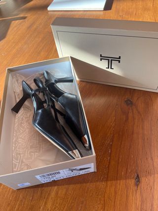 Elegantes zapatos de la marca Latouche, sin estrenar. - Diseño de punta fina. - Detalle metálico en la puntera. - Tira al tobillo para un ajuste seguro. - Tacón fino y estilizado.