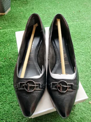 Elegantes zapatos de piel Tamaris en color negro. Combinan estilo y tecnología para usarlos todo el día sin dolor. Estado: Seminuevos, impecables (ver fotos de la suela). Confort: Plantilla Touch-it (efecto memoria) que se adapta al pie. Seguridad: Tacón con sistema Anti-Slide (antideslizante). Detalle: Hebilla metálica frontal y puntera estilizada. Talla: 38. Se envían con sus protectores originales. ¡Listos para estrenar! #Tamaris #ZapatosPiel #Talla38 #ModaOficina #TouchIt #PielReal