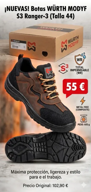 Se venden Zapatos de seguridad de la marca WURTH MODYF, se venden por que uso plantillas y no me adapto, prácticamente nuevos. Color negro con detalles en naranja. Talla 43. Forro interior transpirable Parte superior en microfibra ligera, transpirable e impermeable Puntera de FIBRA DE VIDRIO, plantilla anti-perforación TEXTIL Sin partes metálicas Suela de PU antideslizante SRC, horma ancha Mondopoint 11 S3 A FO SRC DGUV 112-191. No se aceptan cambios ni regateos, se hacen envíos, por favor abstenerse propuestas absurdas.