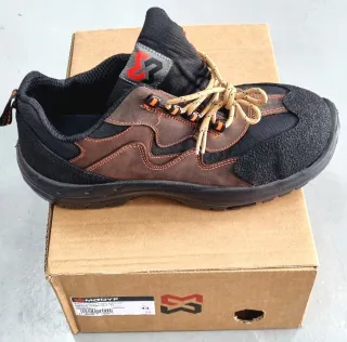 Zapatos de seguridad que se han usado una vez. - Zapato de seguridad sin componentes metálicos con puntera en composite y lámina antiferforante. - Calzado flexible, ligero y que ofrece confort al usuario. - Suela con inyección de PU bidensidad. - Empeine en tejido de piel flor marcada. - Lengüeta de PU poliuretano.