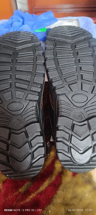 Zapato de Seguridad de Calidad Resistented Robustos en piel costuras reforzadas...100% impermeable.... Suela Antideslizante.. Aislamiento al frío y al calor. Amplios canales de evacuación de líquidos. Muy cómodo. Calzado hidrofugado. Puntera extra ancha. Empeine reforzado. Lengüeta acolchada en tejido transpirable. Mayor resistencia a la abrasión en condiciones extremas. Zona de puente reforzada,absorción de impactos. Puntera protección 200 julios. Metal Free. Están impecables como se puede ver en las fotos las suelas sin ningún desgaste uso dos meses..tiene un pequeño enganchon en el borde interior ver la última foto