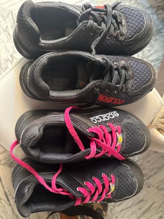 Se venden dos pares de zapatos de seguridad. - Marca Sparco. - Color negro con detalles en rosa. - Cierre con cordones.
