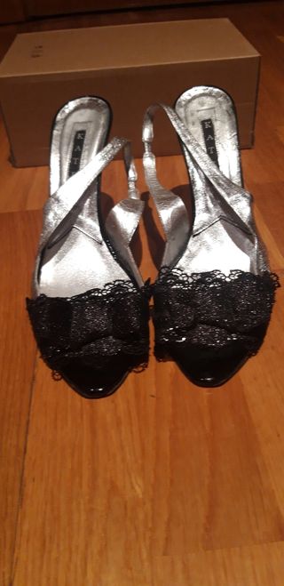 Elegantes zapatos de tacón de 10cm con un diseño sofisticado. - Acabado plateado brillante. - Detalle de encaje negro en la punta. - Tira trasera para un ajuste seguro.Usados,con algún pequeño desgaste mostrado en foto. Comodísimos