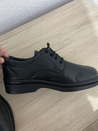 Zapatos de descanso de cuero negro. En la suela se puede apreciar que no están usados. No tienen punta de acero. Pueden servir como calzado de seguridad o como zapatos de traje, son muy cómodos. - Cierre con cordones. - Suela de goma. - Diseño clásico y versátil.