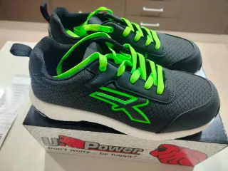 Zapatos de seguridad U-Power Mitch, nuevos y sin usar. - Diseño moderno en color negro con detalles en verde. - Cierre con cordones. - Suela blanca.