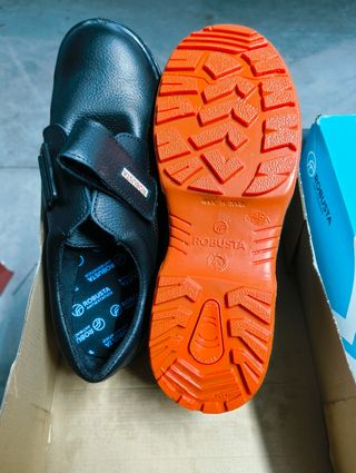 Zapatos de seguridad de la marca Robusta. - Diseño en color negro. - Cordones de color naranja. - Suela de goma naranja.