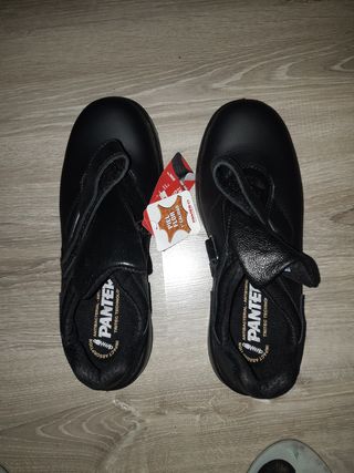Zapatos de seguridad Panter Zion S2, talla 44, piel color negro. Nuevas. Sin cordones. - Modelo Zion. - Puntera plástica. - Suela de PU/PU. - Certificación S2.