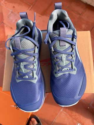 Zapatillas de trail running Altra para hombre en tonos azules y morados. Diseñadas para ofrecer comodidad y rendimiento en terrenos irregulares. - Parte superior de malla transpirable. - Sistema de lazada seguro. - Suela con buen agarre.