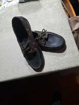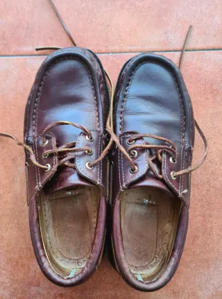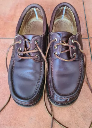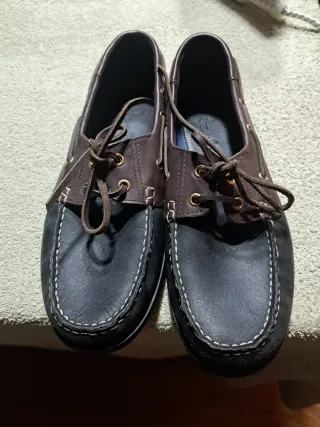Zapato gorila en color azul marino. Cuentan con cordones color marrón para un ajuste seguro. Tienen la plantilla un poco gastada por la parte de atrás (ver fotos) - Material exterior de cuero. - Suela de goma. - Costuras decorativas.