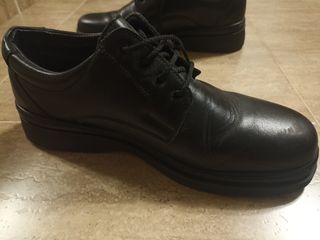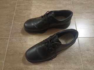 Zapatos de seguridad, usados pero en buen estado. - Son de color negro. - Tienen una suela resistente. - Ideales para trabajos que requieren protección en los pies.