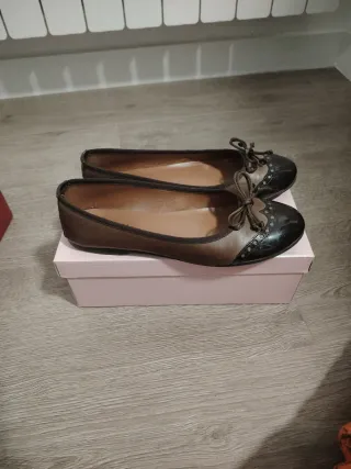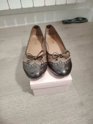 Elegantes bailarinas con un diseño bicolor y detalle de lazo. - Punta redonda. - Acabado brillante en la puntera. - Adorno de puntitos perforados. Tengo más calzado en mi perfil, si te gusta alguno más seguro que llegamos a un acuerdo en el precio Bajo todos los días a Leganés y Aluche