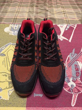 Calzado de seguridad con un diseño moderno y llamativo. - Combinación de colores negro y rojo. - Materiales resistentes para protección.