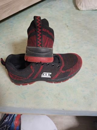 Zapato de seguridad con un diseño moderno y llamativo. - Combinación de colores negro y rojo. - Logo GT en el lateral.