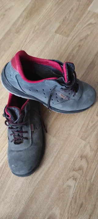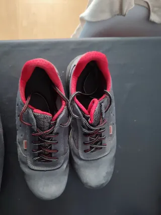 Zapatos de seguridad nuevos, ideales para el trabajo y montaña - Talla 41-42. - Cierre con cordones rojos. - Detalle de costuras rojas. - Logo de la marca en la lengüeta.