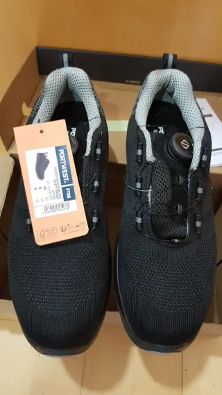 Zapatos de seguridad Port West, talla 42, completamente nuevos. - Cierre con sistema BOA. - Diseño moderno en malla transpirable. - Suela antideslizante. El más moderno zapatos de seguridad actual. Cierre rápido por cable. Plantilla de composite resistente a la perforación. Puntera composite para mayor protección. Suela resistentes a aceites, fuel oil... antiresbalones por cerámica o acero Certificado CE. Precio en mercado más de 76 €
