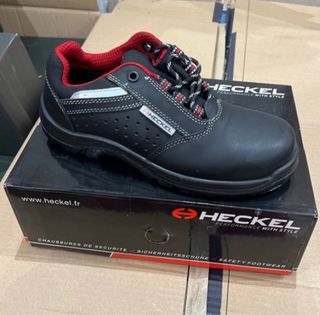 Calzado de seguridad de la marca Heckel. - Color principal negro con detalles en rojo. - Cierre con cordones.