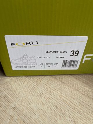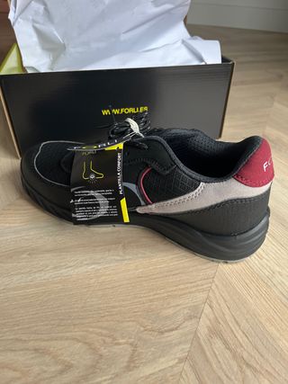 Zapato de seguridad de la marca Forli. Sin estrenar, están en su caja. - Color negro con detalles en rojo y gris. - Talla 39. - Diseño moderno y cómodo.