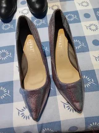 Elegantes zapatos de tacón con un diseño moderno y brillante.Numero 36 - Acabado metalizado. - Tacón fino. - Corte asimétrico.