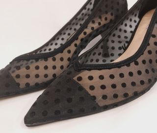 Precioso zapato tacón aguja. Tela transparente con lunares. No me lo he llegado a poner. Me quedé embarazada y me ha cambiado el pie completamente 😭