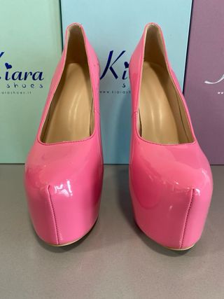 Zapatos de tacón alto cerrados talla 37 de color rosa chicle - Diseño de charol brillante. - Plataforma delantera de 7 cm - Tacón de aguja de 17 cm Solo se usaron para sesion de fotos