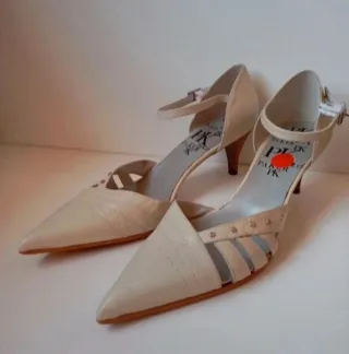Elegantes zapatos de tacón de la marca PK Baker en color beige. Presentan un diseño abierto con tiras y detalle de tachuelas. - Tacón de aguja. - Punta afilada. - Correa ajustable al tobillo. Zapato de tacón con punta y ajuste con hebilla al tobillo. Tacón bajito. Paker número 37. Color perla. Largo suela 27cm Alto tacón 6cm