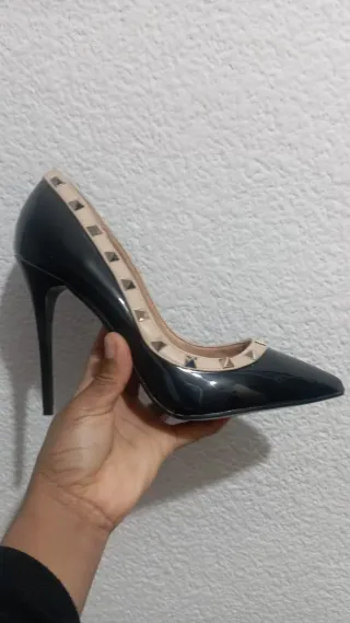 Zapatos de tacón negros y beige con tachuelas