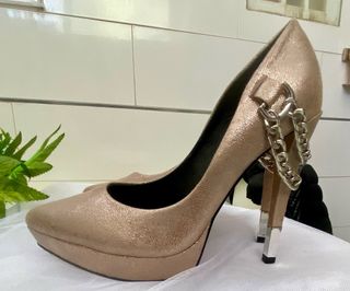 Elegantes zapatos de tacón alto de la marca Guess originales. Talla 39 amplia - Diseño con plataforma. - Adorno de cadena metálica en el tobillo. - Tacón metálico con acabado plateado -Medida del tacón 14cm (alto) Solo el plateado del tacón está un poco desgastado. No se nota. Por lo demás, en perfecto estado. Apenas usados. Quedan preciosos puestos y muy sexys