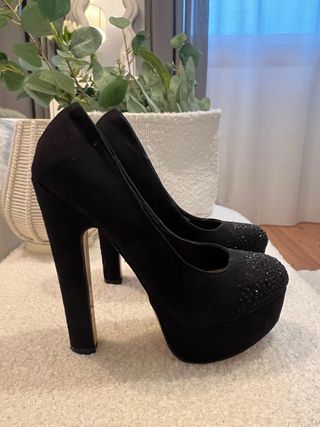 Elegantes tacones negros con plataforma y detalles brillantes. - Acabado en ante. - Adornos de pedrería en la punta. - Tacón grueso y alto.