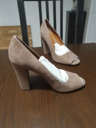 Elegantes zapatos de tacón alto en color beige, perfectos para cualquier ocasión. Están completamente nuevos y sin uso. - Diseño slingback con tira al talón. - Tacón de madera con un diseño moderno. - Material exterior con acabado aterciopelado. PIEL VACUNA DE PRIMERA CALIDAD