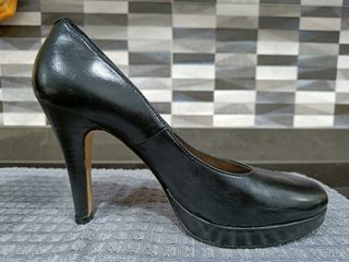 Zapatos de tacón negros de piel, con banda elastica en el empeine. Son comodos de poner y quitar y de llevar, pero tienen tacón alto. Marca Abril, hechos en España y de calidad. Me los he puesto dos veces, para conferencias, pero no son mi estilo y no los uso. Estan como nuevos, en su caja original