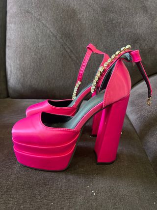 Zapatos de tacón elegantes, usados una sola vez. - Diseño de plataforma. - Correa con hebilla plateada. - Tacón grueso y alto.