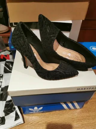 Preciosos zapatos de salón de la marca Marypaz. Son de color negro y tienen un elegante tacón alto. - Diseño peep-toe. - Material de raso. - Perfectos para una ocasión especial.