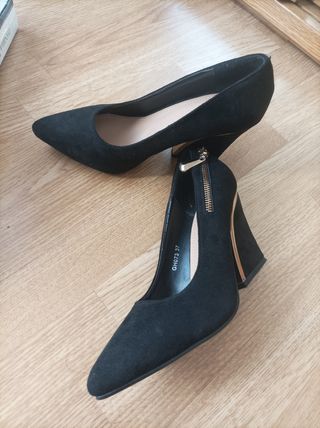 Preciosos zapatos de tacón alto, color negro y talla 35. Son elegantes y en muy buen estado. Un sólo uso. - Diseño sofisticado con abertura. - Tacón fino y alto. 12 cm - Material de ante y brillo.