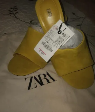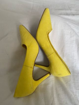 Elegantes zapatos de tacón de Zara en llamativo color amarillo. - Diseño slingback con tira al talón. - Punta afilada. - Detalle de nudo en la parte delantera. *PRECIO NEGOCIABLE* *ENVÍOS A TODA ESPAÑA*