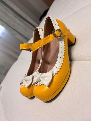 Estos encantadores zapatos de estilo vintage combinan blanco y amarillo. - Diseño con tira al tobillo y cierre de hebilla. - Detalle de lazo blanco en la punta. - Adorno festoneado en el borde. - Tacón ancho. Tienen los roces que se muestran en las fotos sin afectar al material.