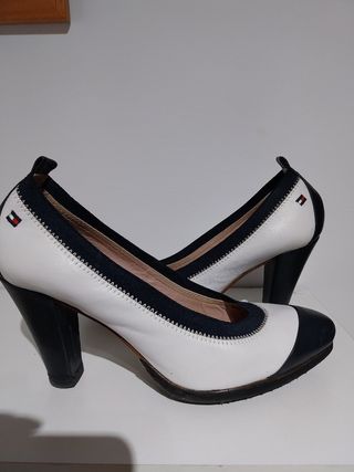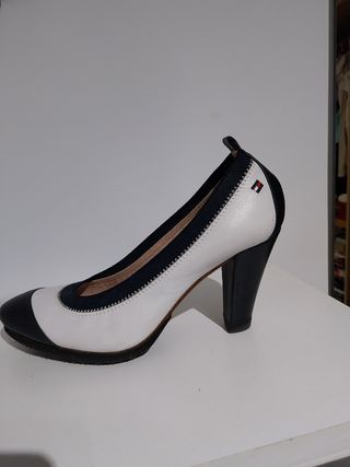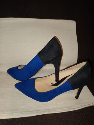 Zapato salón con tacón fino de 9cm de alto. Combinación de color azul azafata más negro. Una sola puesta muy poco rato, son muy cómodos.