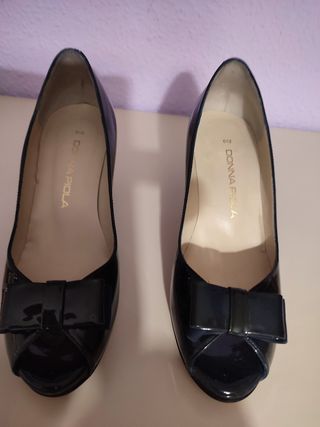 Zapatos de salón en piel buena de charol, en color azul marino. Número 36 Descubiertos por delante y con un lazo. Altura del tacón de 9cm Son muy elegantes. Solo usados en una ocasión Plataforma delante de aprox 1'5 cm De la marca Donna Piola Costaron 55 € y los dejo en 25 € Tienen su caja