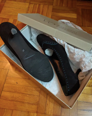 Súper cómodos porque tienen plataforma por dentro .Pone 37 pero calza pequeño porque yo uso el 36 y me quedan bien . Van con recambio de tapas y en su caja original . Eran de 34,99