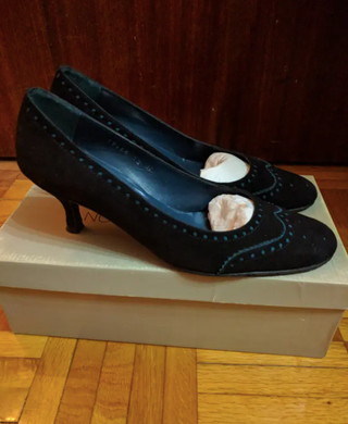 Zapatos elegantes y de buena calidad, de ante negro con topos y ribete en azul petróleo, tacón medio de 6'5cm. Nuevos impecables, en su caja, una sola puesta. Número 37. De la zapatería "Calzados Mario". Precio original: 74'95€. @Karbayona