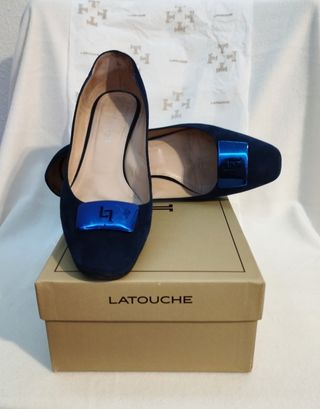 Zapatos Latouche tipo salón de ante azul oscuro con detalles metalizados. Muy estilosos. Talla 40. Costaron 149 €. Con su caja y su funda. Metidos en la horma porque me resultaban muy estrechos. Con muy poco uso
