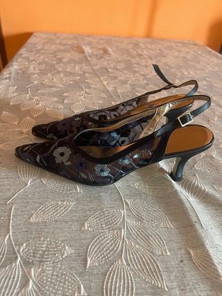Elegantes zapatos de tacón de Zara, talla 37, en un bonito color azul. Son nuevos, sin estrenar. - Diseño slingback. - Punta afilada. - Tacón fino.