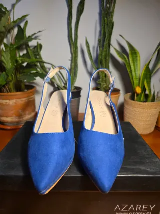 Elegantes zapatos de tacón Azarey en un vibrante color azul. Perfectos para añadir un toque de estilo a cualquier atuendo. - Material exterior tipo ante. - Diseño slingback con tira al talón. - Tacón de altura media. - Punta fina.