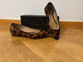 Elegantes zapatos planos con estampado animal print. - Diseño de punta afilada. - Detalle metálico en el tacón. - Son zapatos cómodos aunque un poco bajo de puntera