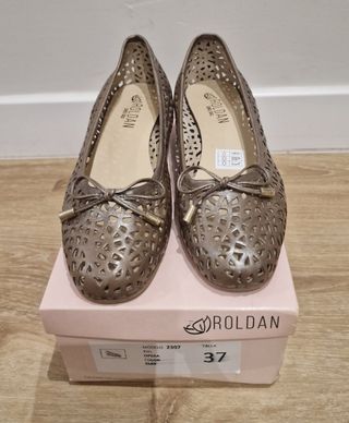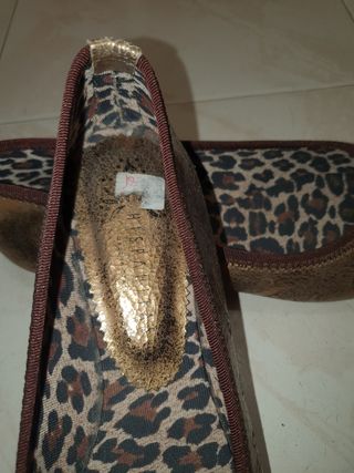 Zapato de tacón bajo y color dorado. Eran de 185 euros, como se puede ver en la etiqueta que queda en el talón.