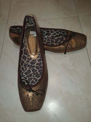Bailarinas de piel plateadas y con un fino estampado de animal print, y un tacón bajo y cuadrado de 5 cm. Están impecables con muy poco uso.