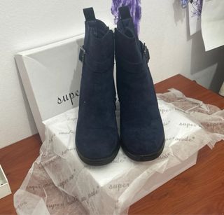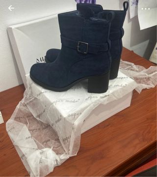 Botines de ante azul marino, ideales para el otoño. Son de tacón bajo y tienen una hebilla decorativa. Están en perfecto estado. - Tacón bajo cómodo. - Hebilla decorativa. - Material: ante.