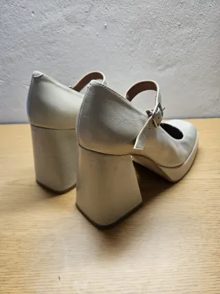 Preciosos zapatos de tacón blancos. Ideales para una ocasión especial. Son entre blanco roto y beige - Son de cuero. - Tienen un diseño elegante y sencillo. - El tacón es de 7'5cm - Se encuentran en buen estado no los he podido usar ,por dentro se ha pelado de estar guardados pero por fuera nuevo