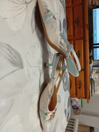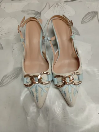 Elegantes zapatos de tacón con un delicado bordado floral. - Diseño de punta afilada. - Adorno de cadena dorada en la pala. - Tira trasera ajustable. - Detalle de cinta azul claro. Super cómodos y quedan espectaculares